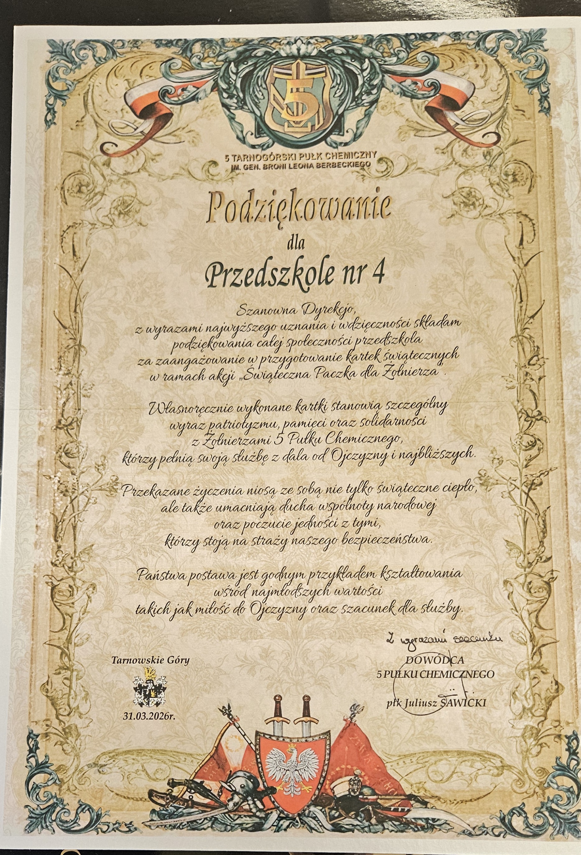 Nasze przedszkole wzięło udział w "Świątecznej Paczce dla Żołnierza". W ramach tej akcji przygotowaliśmy kartki świąteczne i słodki upominek dla żołnierzy, którzy pełnią służbę z dala od Ojczyzny i najbliższych.